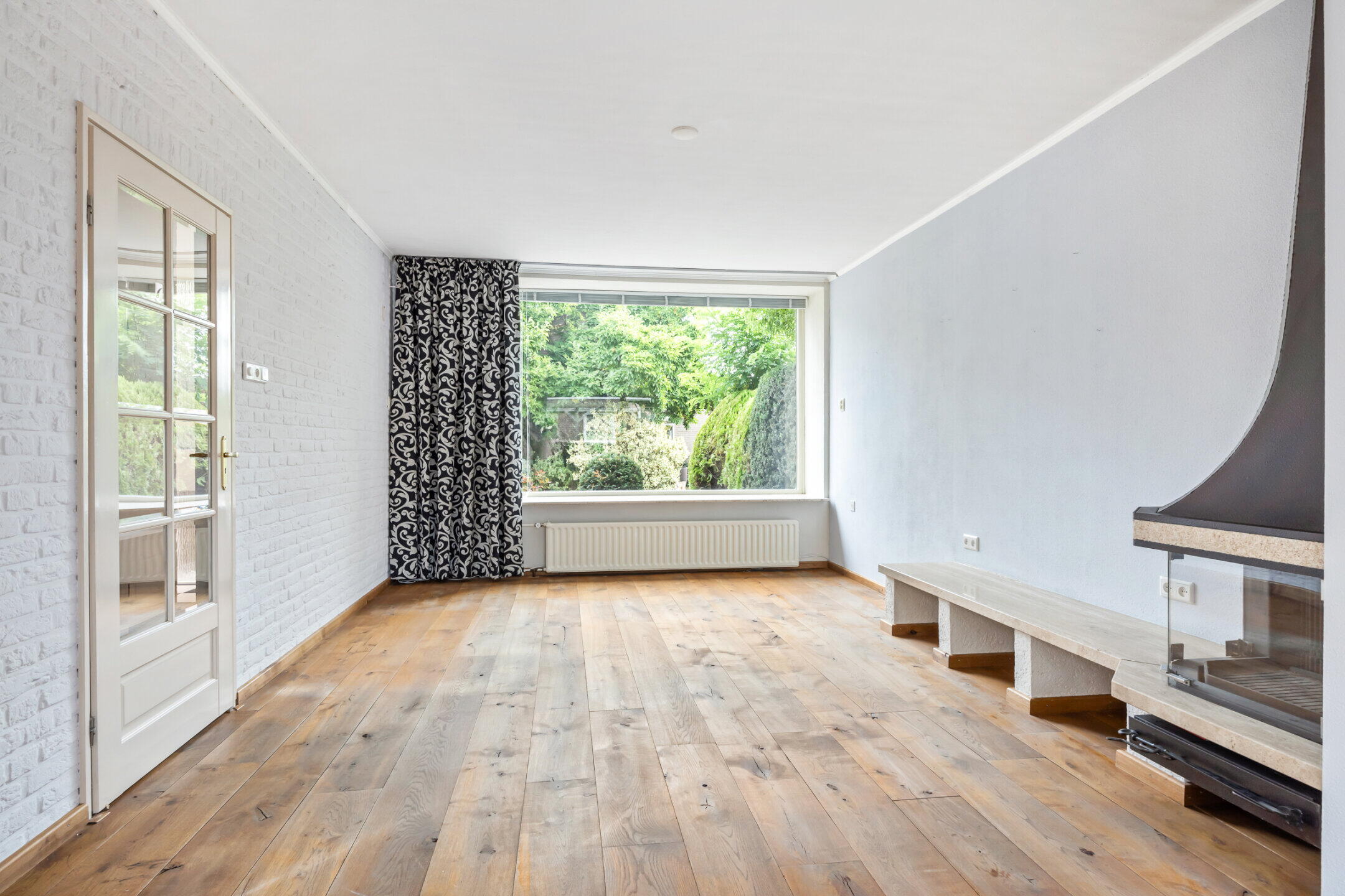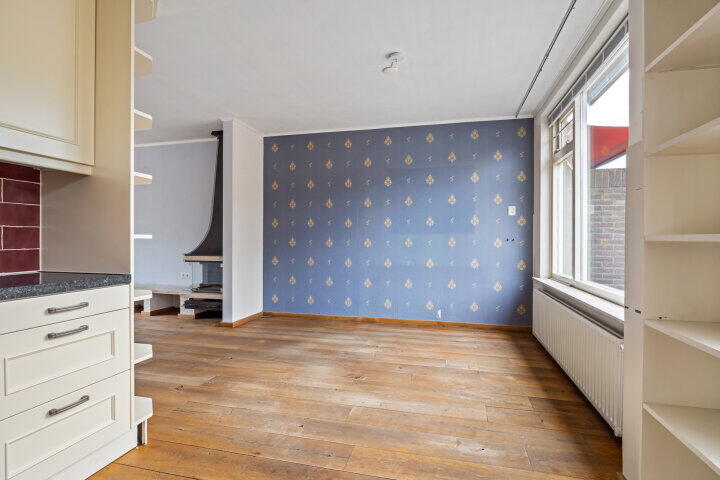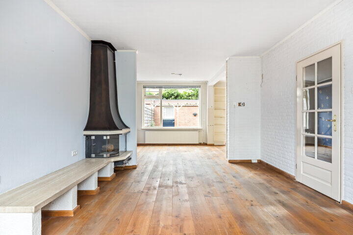 De verrassend ruime woonkamer (ca. 8.51 x 3.68m) is voorzien van een mooie eikenhouten vloer, een sfeervolle houthaard en een erkerraam aan de voorzijde met een prachtige lichtinval.