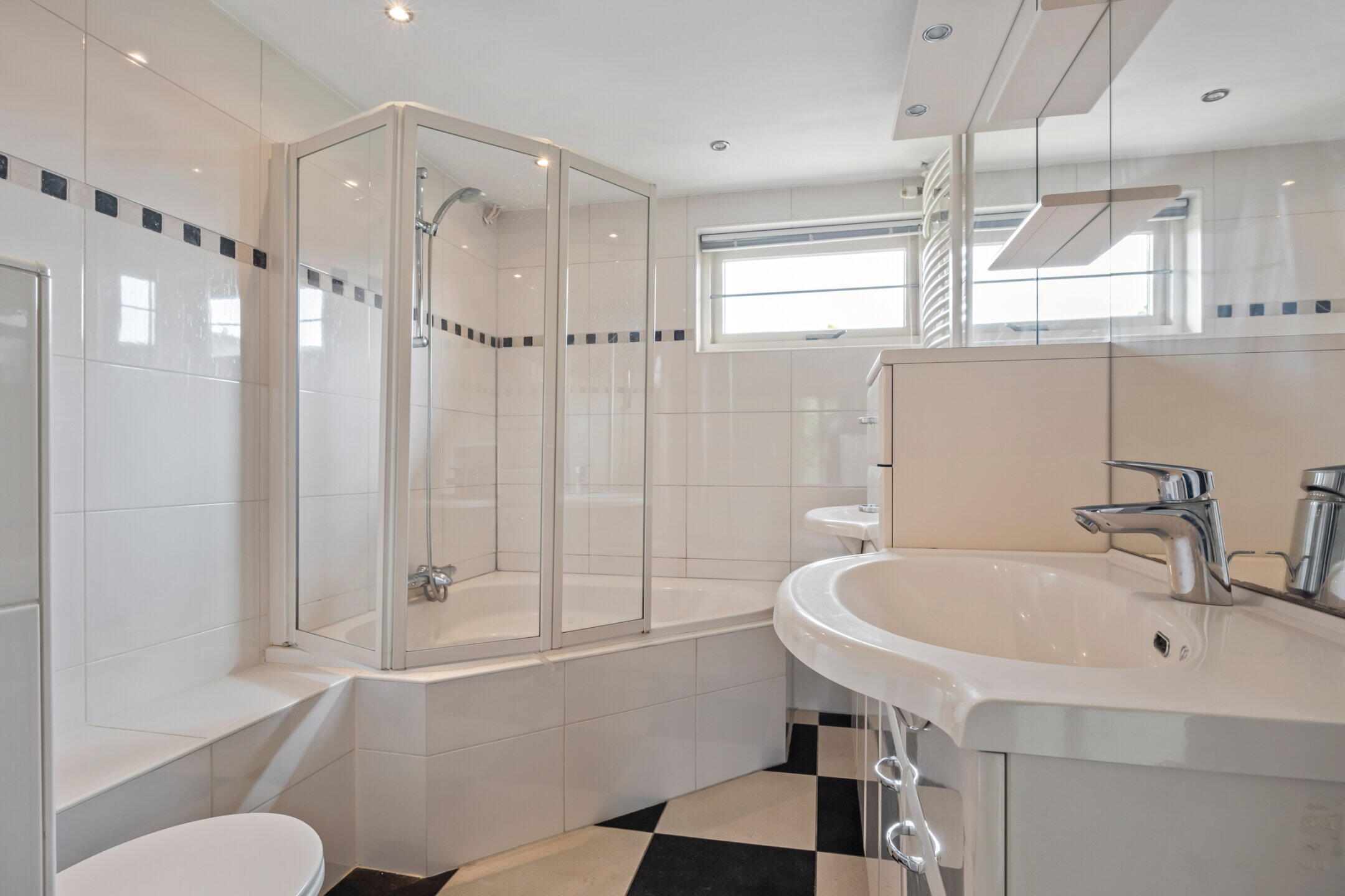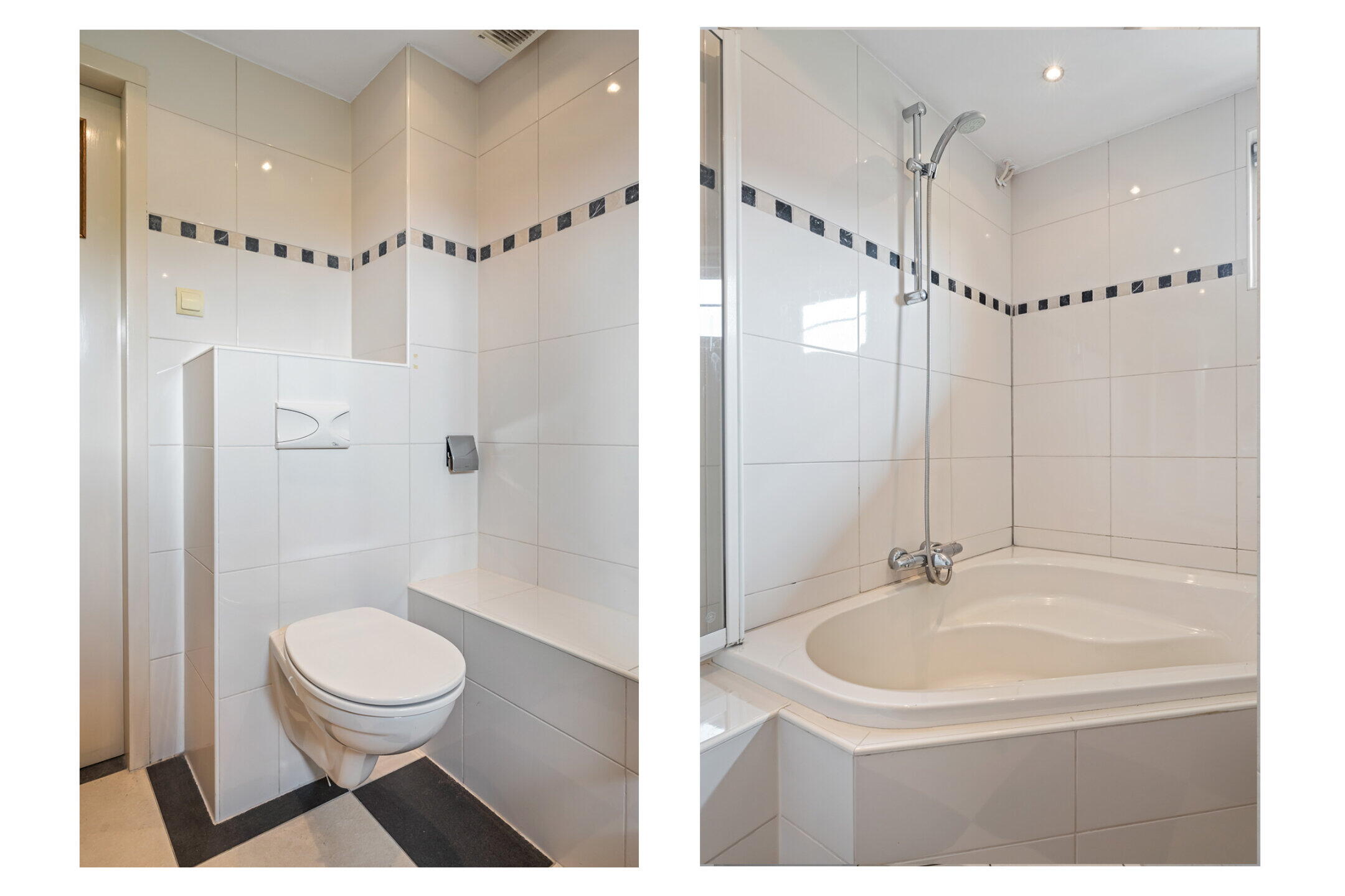 De geheel betegelde badkamer (ca. 2.85 x 1.98m) is voorzien van een ligbad met een harmonicascherm en douchegarnituur, een hangend closet met inbouwreservoir, dubbele wastafel in meubel, designradiator, diverse plafondspots en mechanische ventilatie.