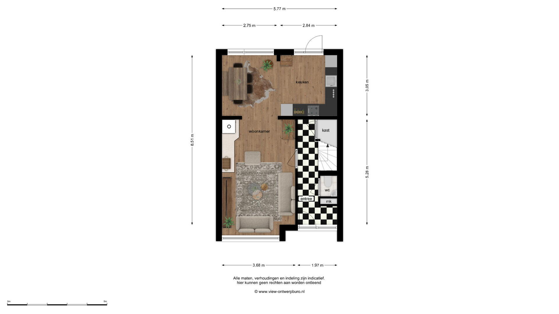 - 59 m² (10 meter diep en 5.9 meter breed)