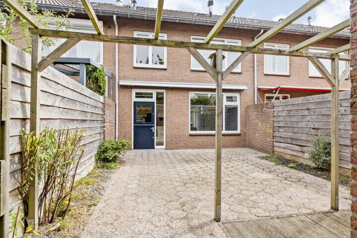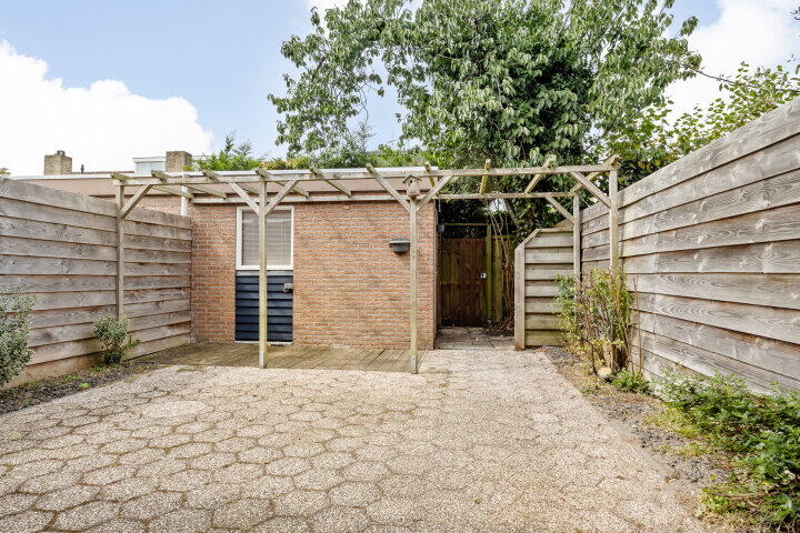 De tuin is grotendeels betegeld en voorzien van een schutting, borders, buitenkraantje, een achterom, plaats voor de kliko’s en een groot elektrisch zonnescherm tegen de achtergevel.