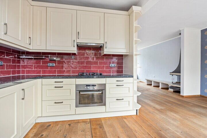 De open keuken (ca. 3.05 x 2.84) in een hoekopstelling beschikt over een natuurstenen werkblad, veel onder- en bovenkastruimte en diverse inbouwapparatuur waaronder een 4-pits gaskookplaat, rvs afzuigkap, een koel/vriescombinatie, oven, vaatwasser en een ronde spoelbak. De keuken is eveneens afgewerkt met de mooie eikenhouten vloer en geeft middels een duodeur toegang tot de achtertuin.