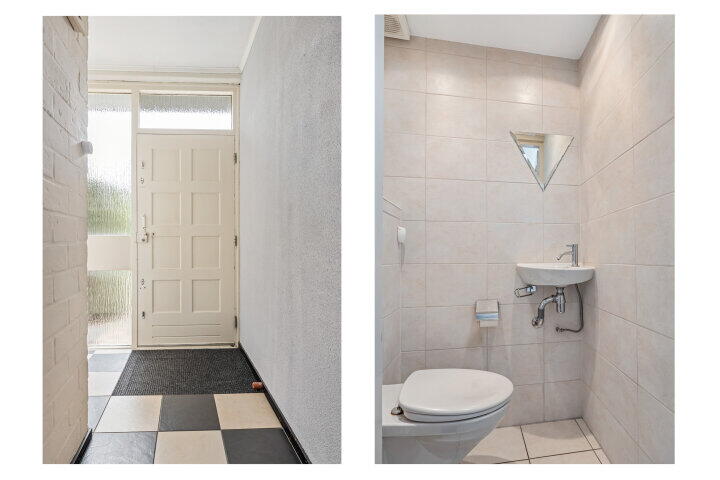 Entree/hal (ca. 5.28 x 1.97m) met de meterkast, de trapopgang naar de eerste verdieping, een handige trapkast en de geheel betegelde toiletruimte voorzien van een hangend closet met inbouwreservoir, fonteintje, diverse plafondspots en mechanische ventilatie.